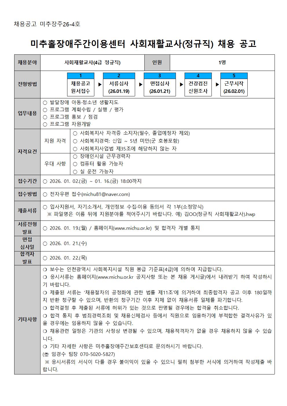 - 미추홀장애주간이용센터 사회재활교사(정규직) 채용 공고