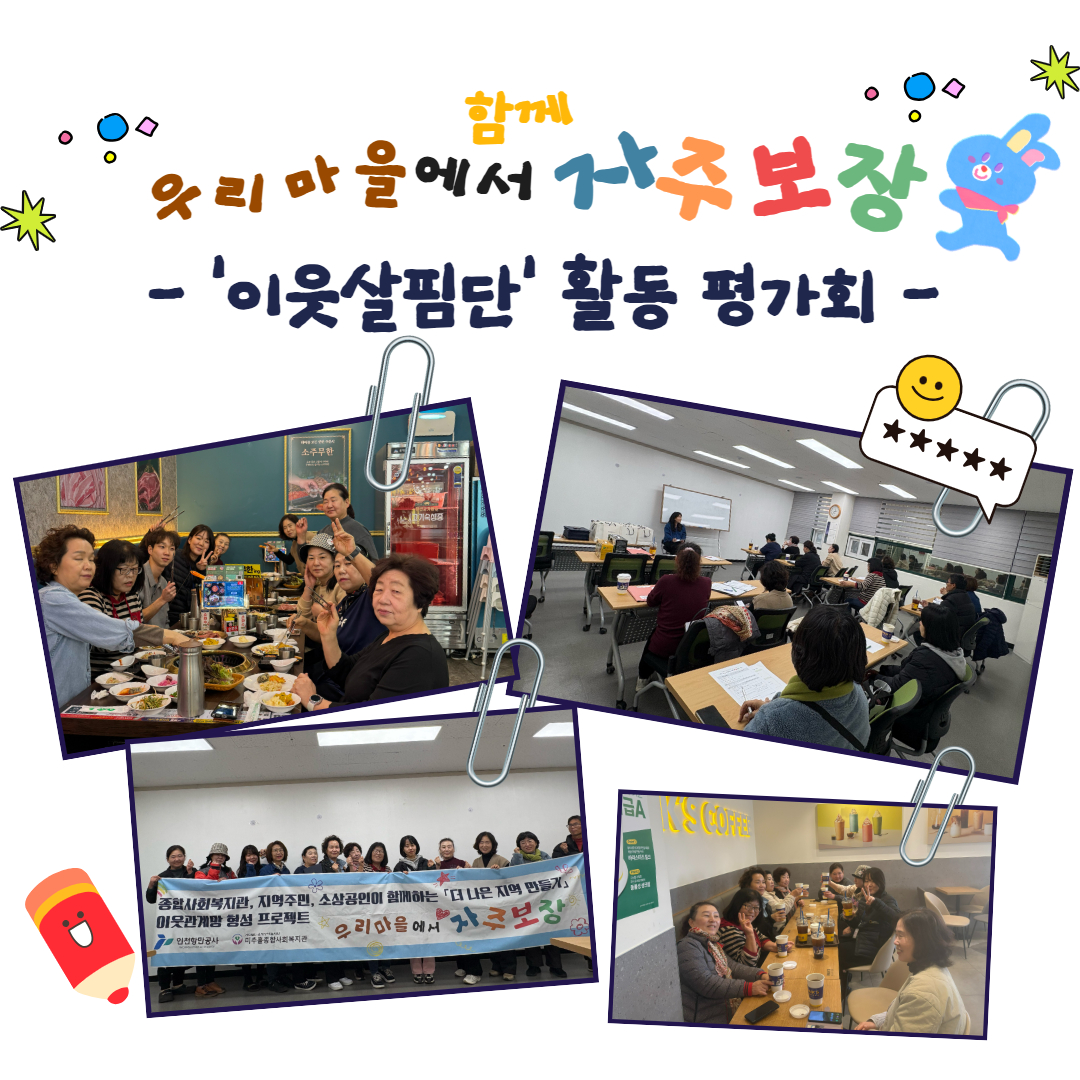 평가회에서는 활동만족도 평가, 아쉬웠던 점을 정리하고 향후 활동을 이어갈 수 있는 방안도 논의하는 시간을 가졌습니다. 이웃살핌단 활동 종료 후에도 관계를 이어갈 수 있도록 '투마잇 나눔단'으로 연결하여 생필품 지원, 정기적 안부확인, 지속적인 이웃관계를 유지하며 마을 내 상호돌봄 체계를 이어갈 예정입니다.