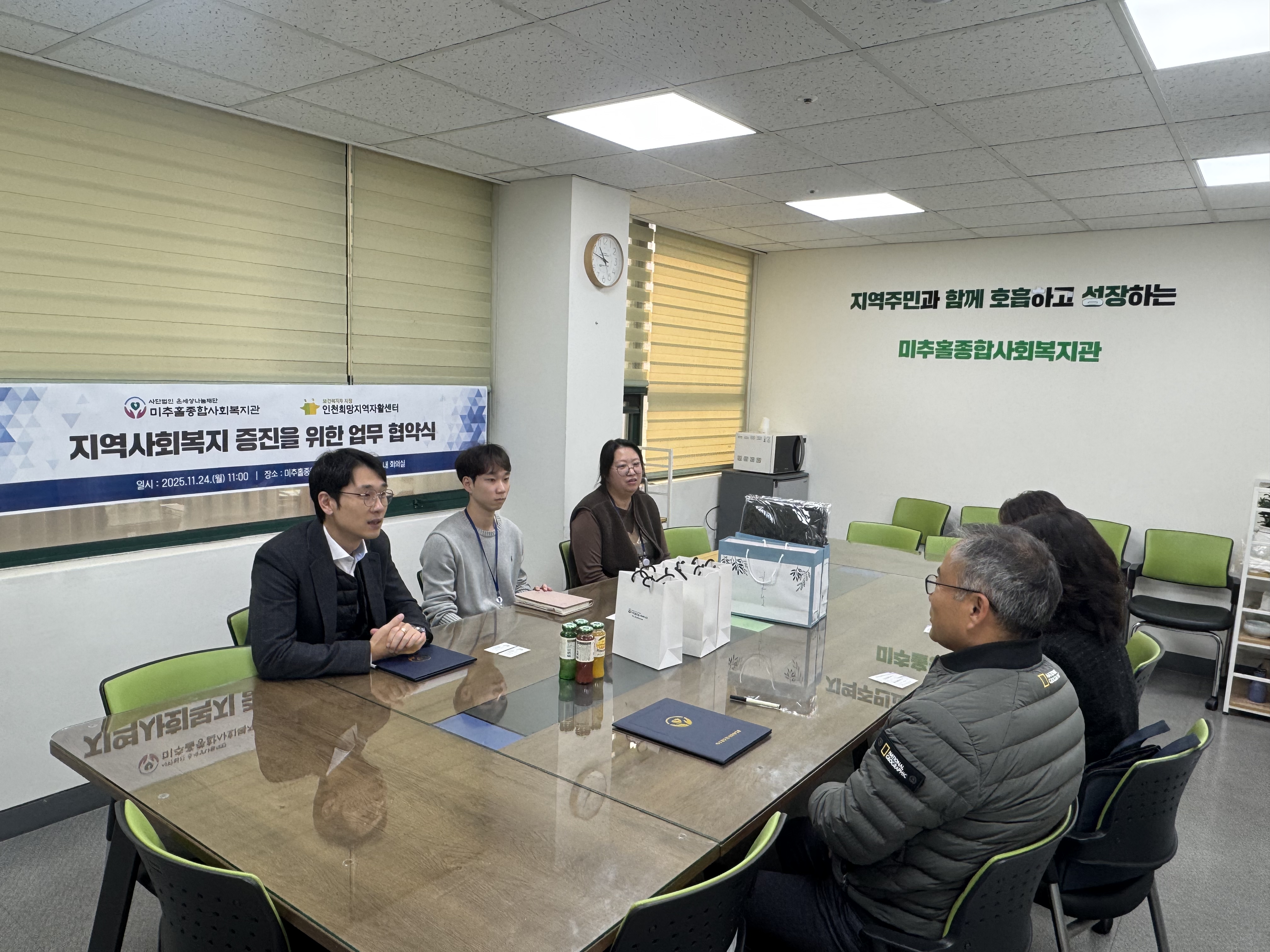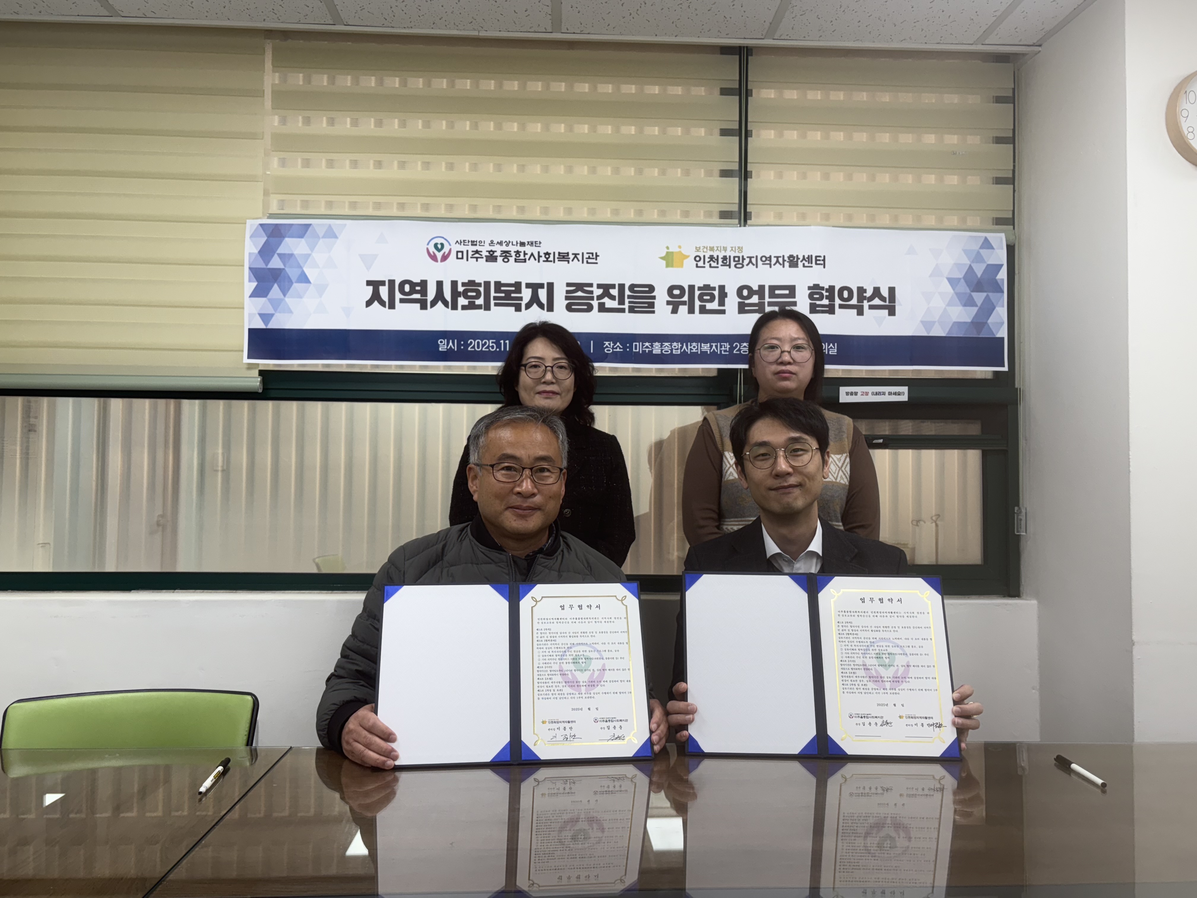 미추홀종합사회복지관과 인천희망지역자활센터는 지역사회 발전을 위한 상호교류와 협력증진을 위해 업무 협약을 체결했습니다.