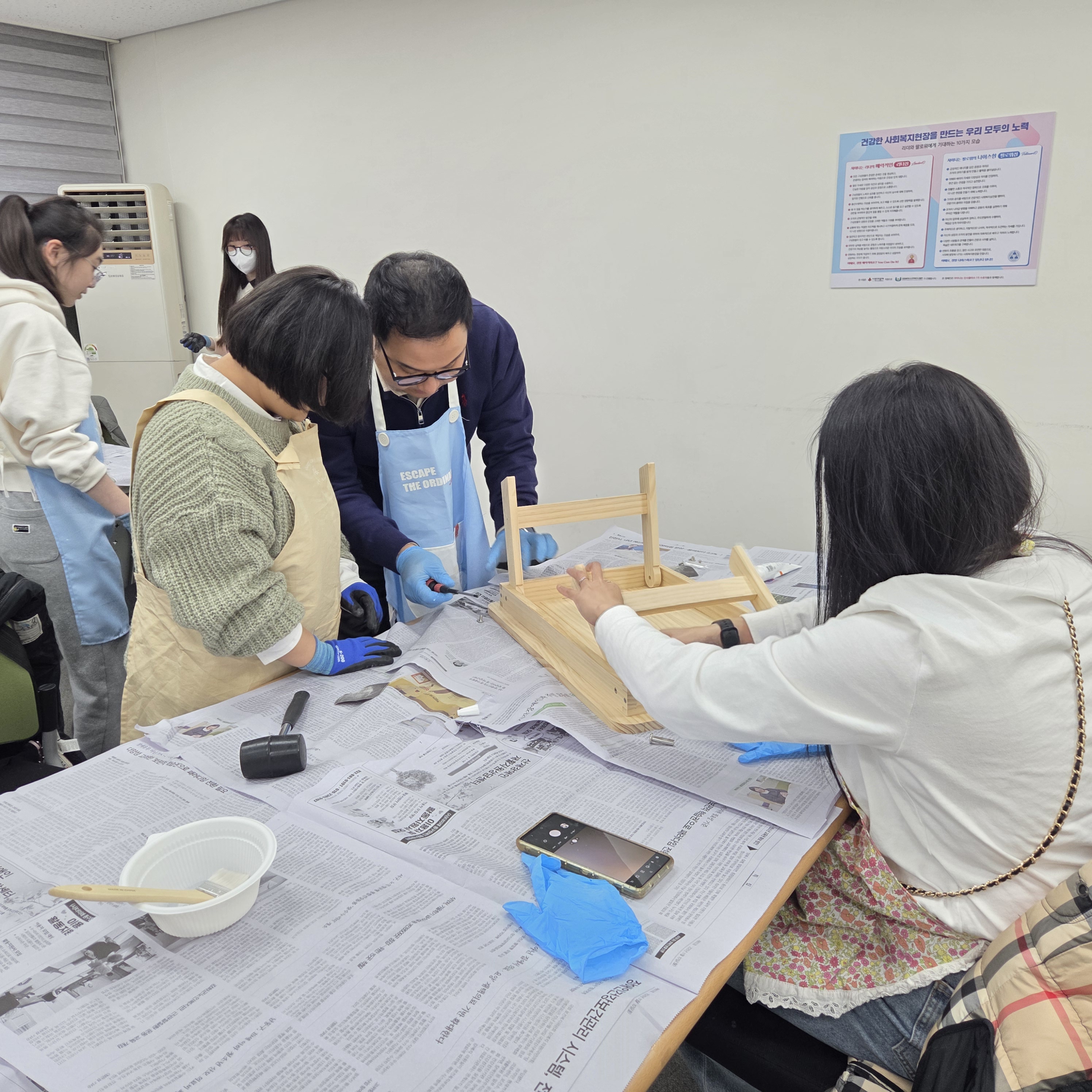 뚝딱뚝딱 망치질 한번에 테이블 다리가 금방 만들어지고~ 쓱싹쓱싹 붓질 몇번에 번쩍번쩍한 테이블이 완성되었습니다!! 모두들 즐거운 분위기에 이야기꽃을 피우며 프로그램 진행 후 센터 인근에 있는 오봉집에 들려 맛있는 저녁식사시간을 가졌습니다^^