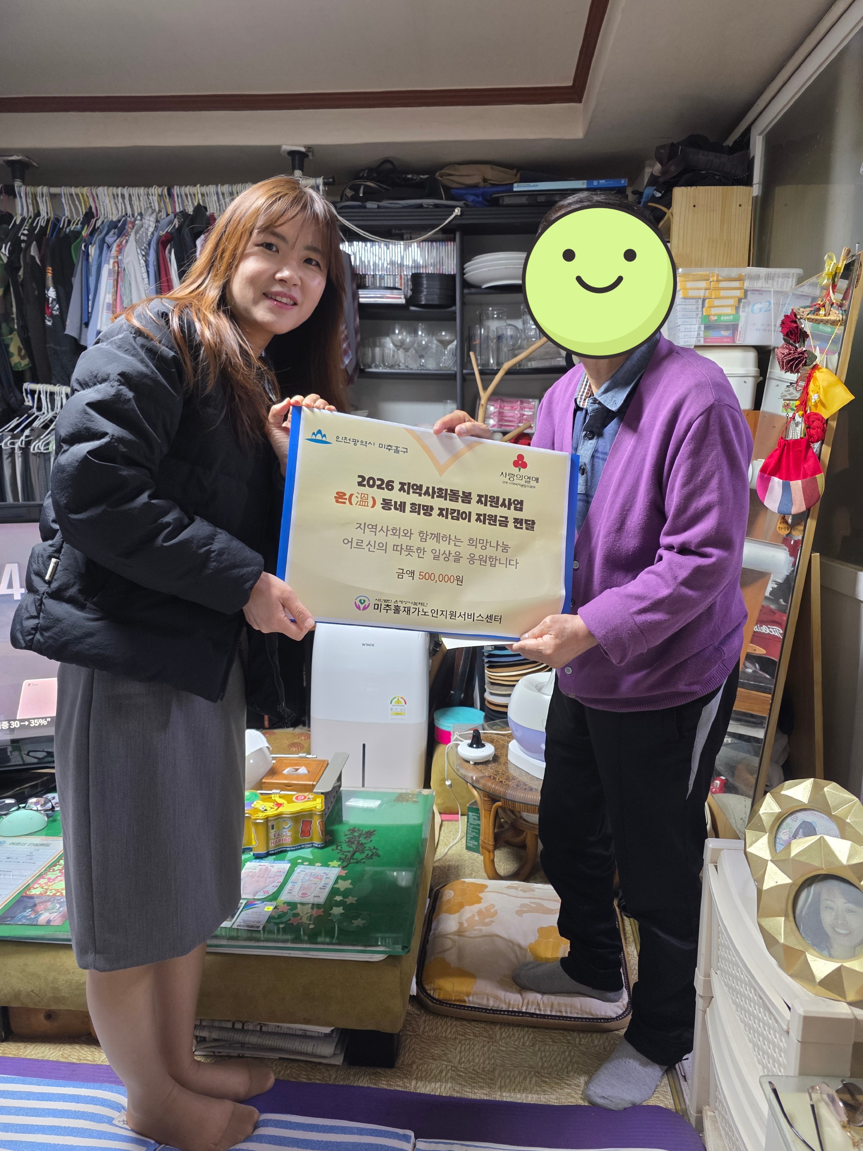 미추홀구지역사회보장협의체과 인천사회복지공동모금회에서 주관하는 온동네 희망 지킴이 긴급 생계비 지원에 황○○어르신이 선정되었습니다.