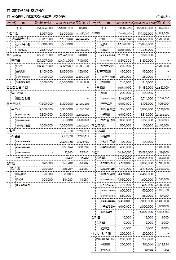 사회복지법인 및 사회복지시설 재무회계규칙 제10조 제4항에 의거하여 2017년 미추홀장애주간보호센터 1차 추가경정예산서를 붙임과 같이 공고합니다.