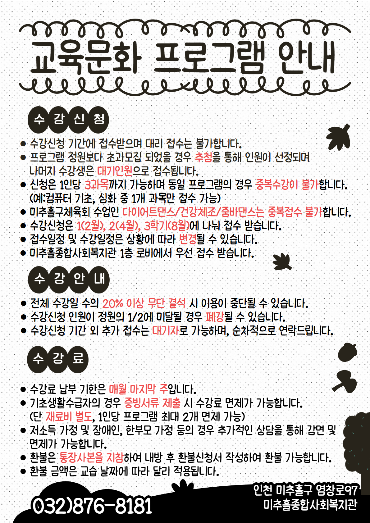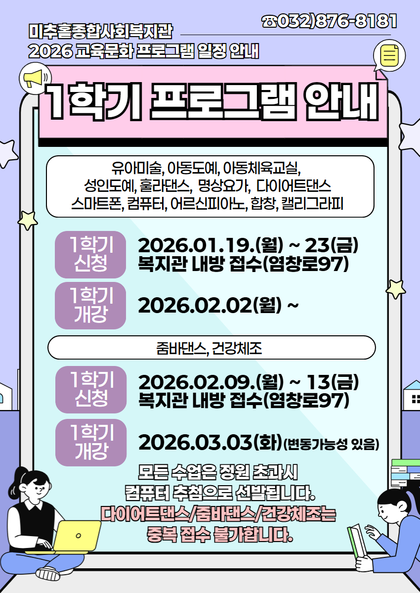 미추홀종합사회복지관에서 2026년도 1학기 교육문화 프로그램 수강생을 모집합니다!