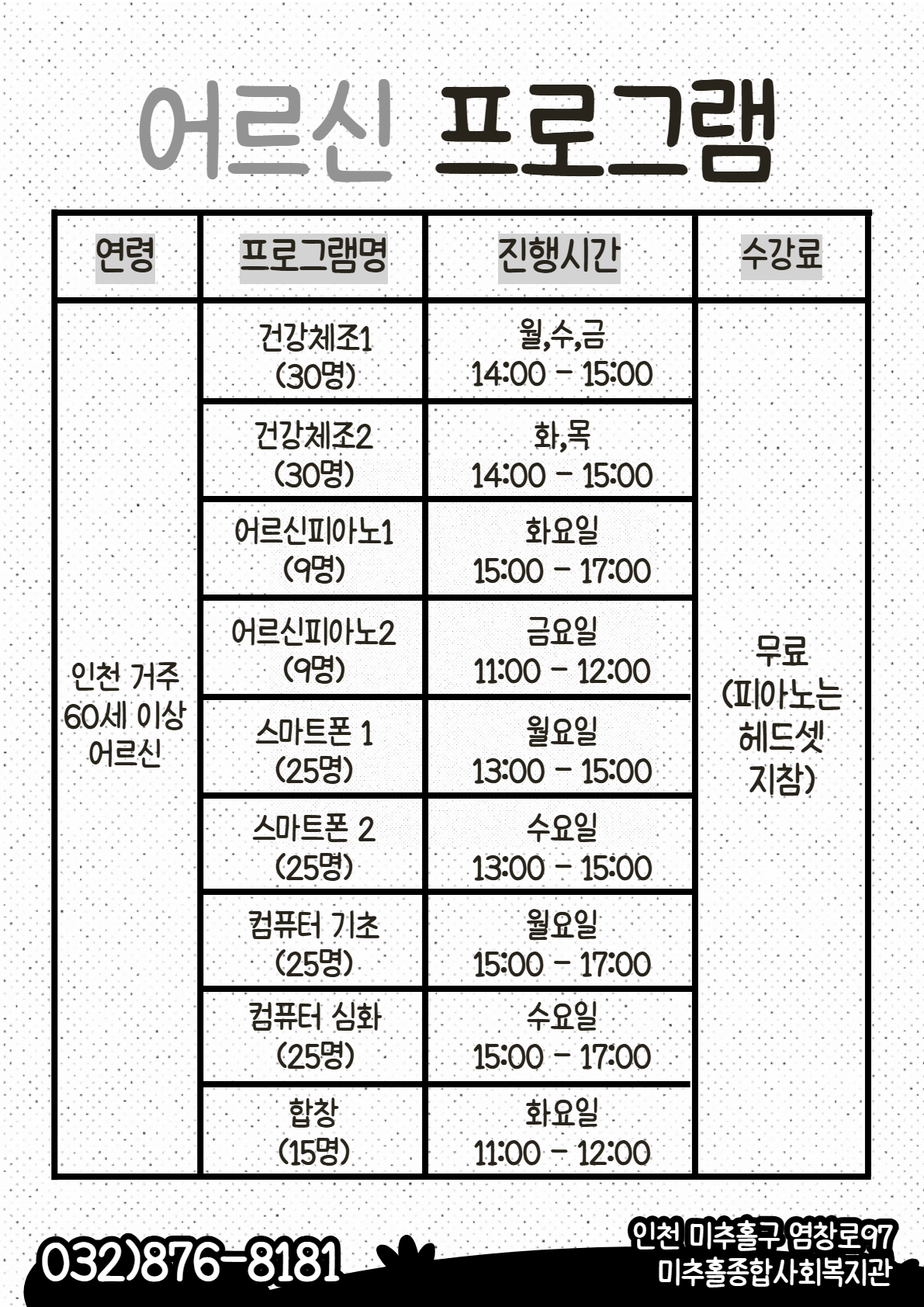 - 어르신 : 스마트폰1/2, 컴퓨터기초/심화, 어르신피아노1/2, 합창