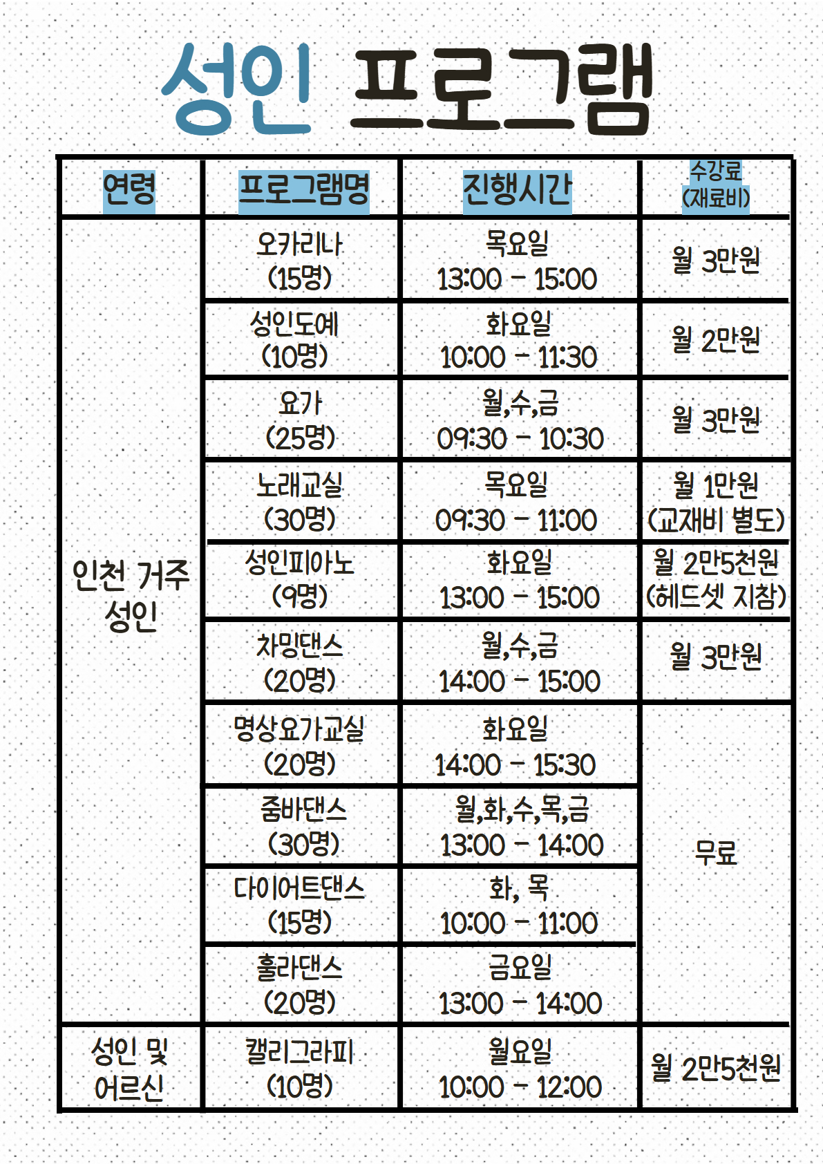 - 성인 : 성인도예, 명상요가교실, 오카리나, 요가1/2, 성인피아노. 노래교실, 다이어트댄스, 훌라댄스, 차밍댄스, 캘리그라피