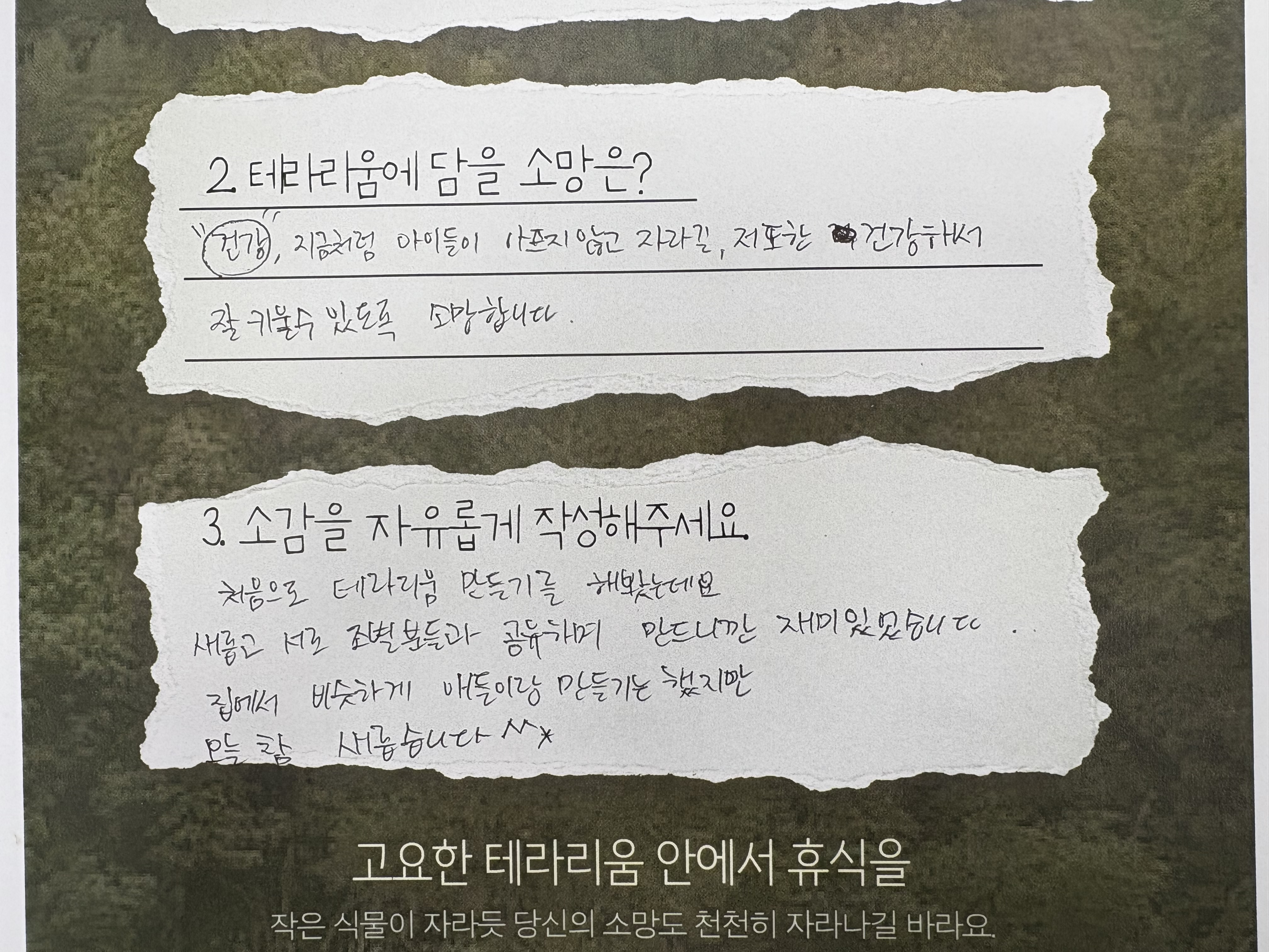 오늘 1회기에서는 본인의 소망을 담은 테라리움을 만든 뒤 함께하는 참여자들과 서로의 소망을 공유하였습니다. 마지막 회기까지 제일 잘키운 사람에게는 강사님께서 선물도 주신다고 약속하셨습니다~!