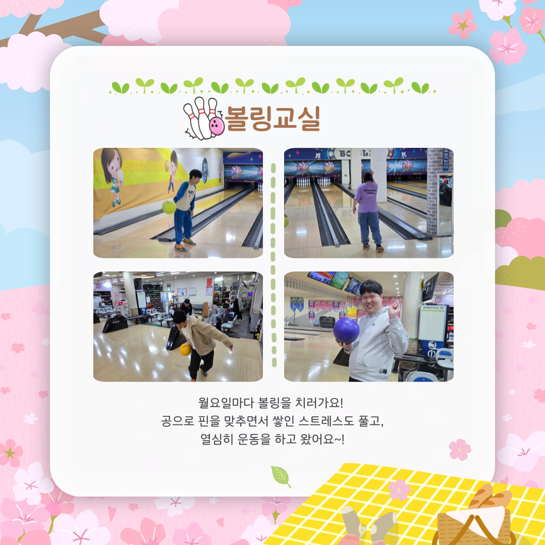 월요일엔 볼링을 치러갑니다. 공으로 핀을 맞추면서 스트레스도 푸는 좋은 기회가 되었습니다!